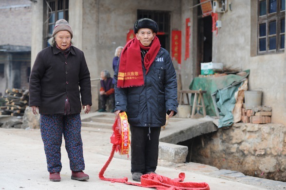 抗战老兵胡得红用当地最为隆重的仪式表达了收到冬衣的喜悦--他放了一串长长的鞭炮。